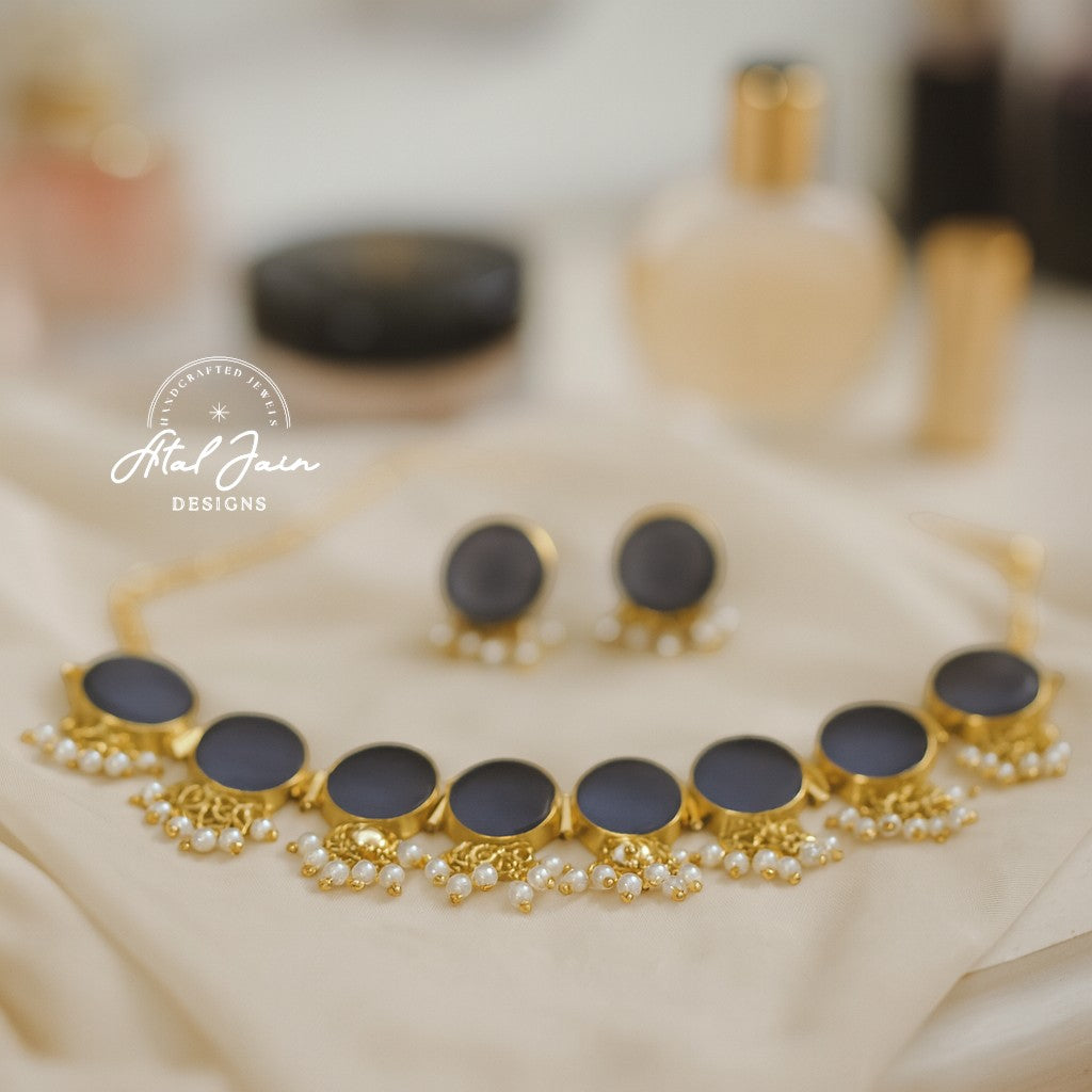 Enhance your outfit with the Azure Elegance Choker and Earring Set. This ethnic-inspired set adds a touch of elegance to any look. Show off your unique style with this playful and eye-catching combo. (You'll be the envy of everyone at the party!)