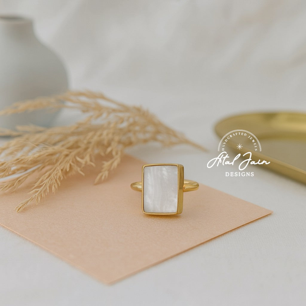 Add a touch of ocean vibes to your style with our Ethereal Ocean Jewel Ring. Featuring a beautiful mother of pearl gemstone in a unique bezel setting, this ring will add a subtle yet stunning touch to any outfit. Dive into a world of elegance and beauty with this ethereal piece.