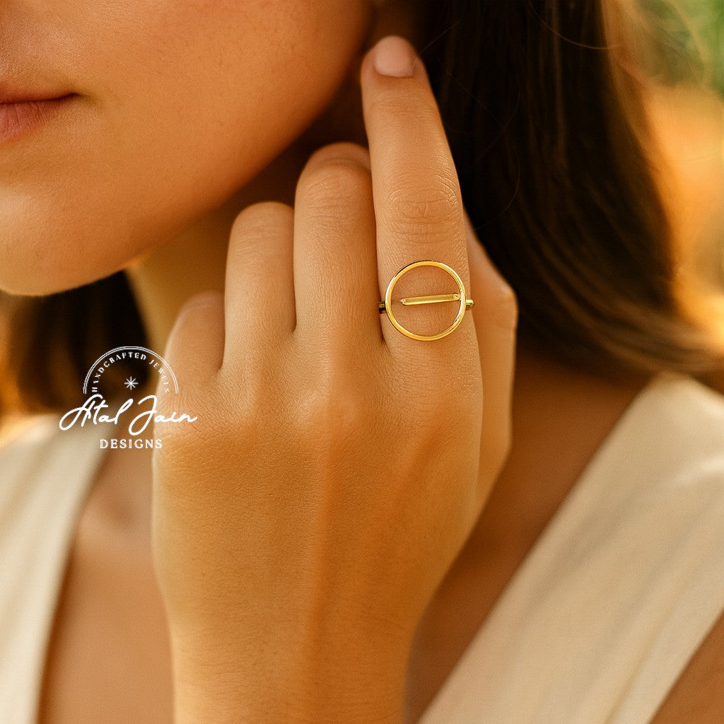 Add a touch of geometry to your outfit with our Golden Geometrical Ring. Its unique design is sure to catch attention and elevate your style. (Warning: may cause extreme admiration from onlookers!)