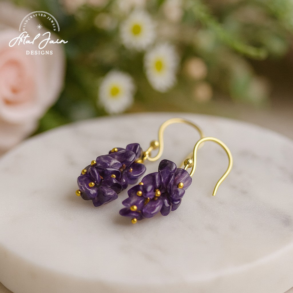 Shimmer and shine in these playful Grapes in Shadow earrings! Spark your look with this elegant statement piece, inspired by grape bunches and crafted with natural gemstones. Perfect for adding a touch of whimsy and sophistication to any outfit.