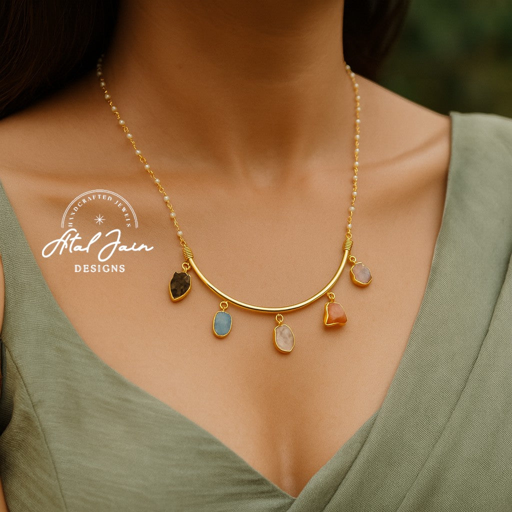 Sparkle and shine with our Majestic Half Moon Treasures Pendant! Adorned with five stunning semi precious gemstones, this necklace will add a touch of elegance to any outfit. (You're sure to be the envy of all your friends!)